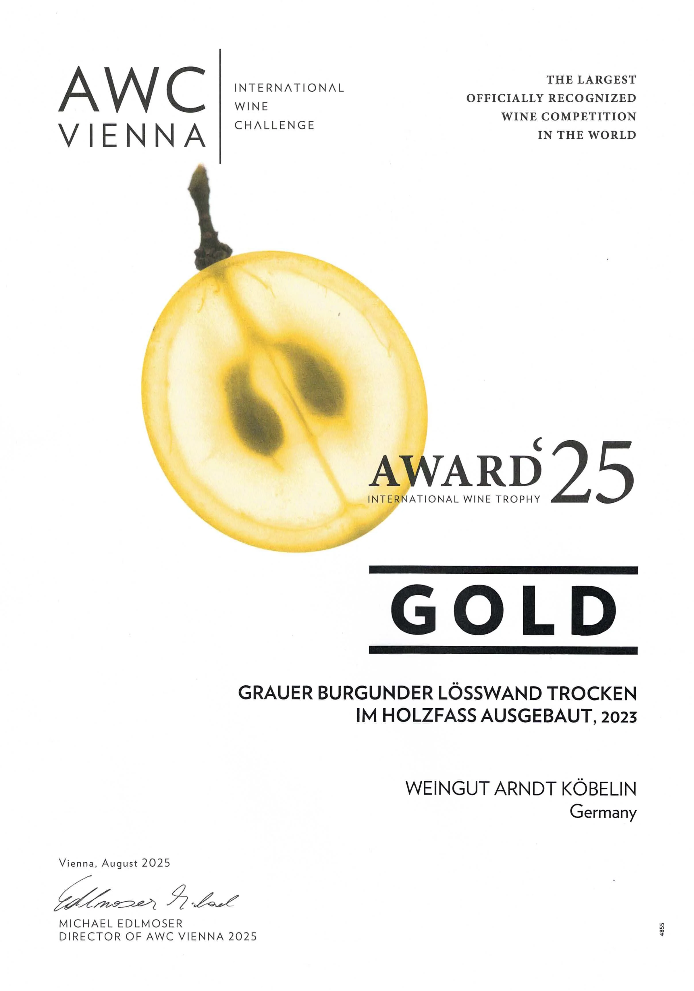 2025: 1. Platz für unseren “Weisser Burgunder RÉSERVE Steinenweg” - Trophy Sieger!